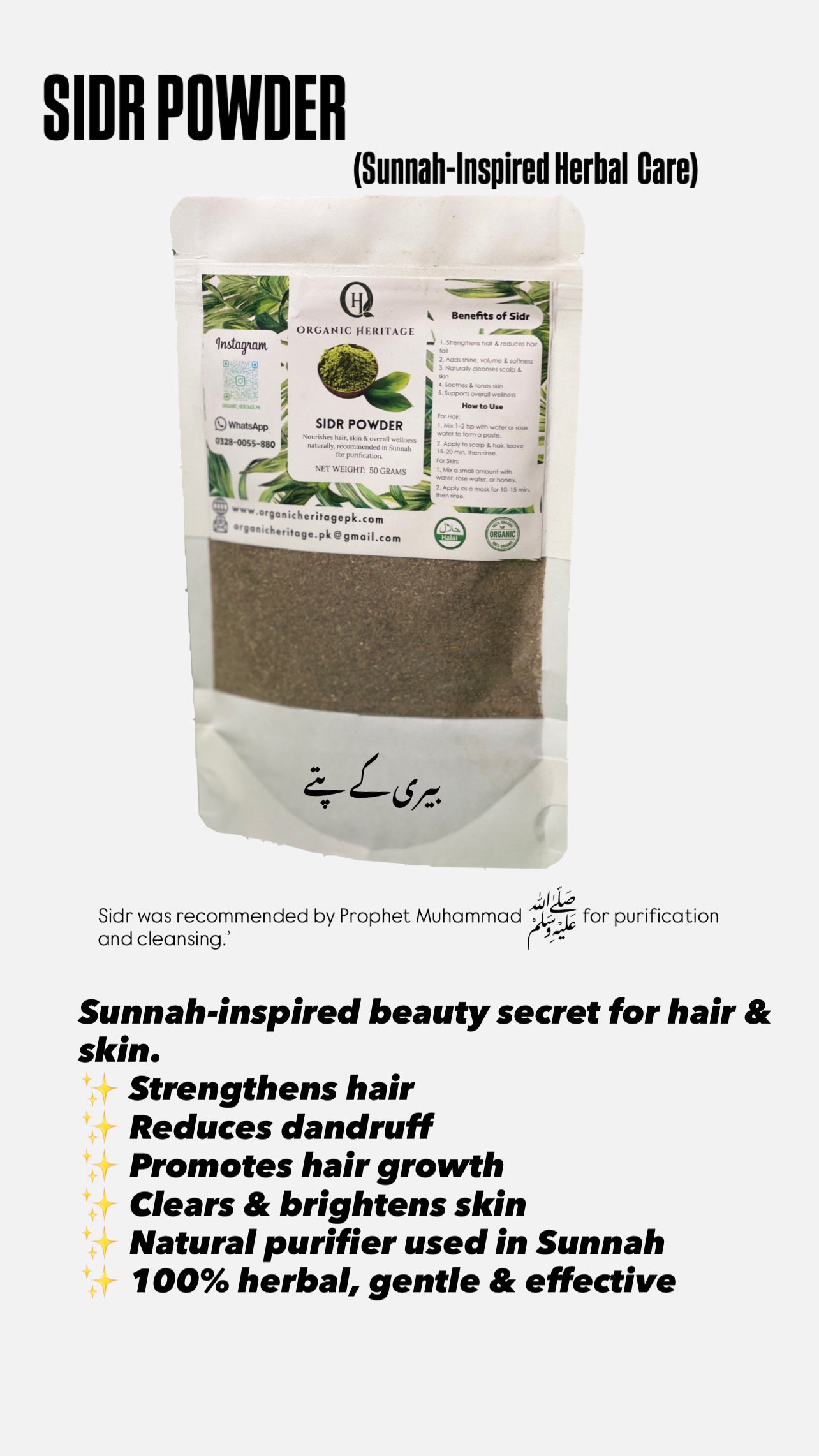 Organic Heritage SIDR (Beri) Powder is a 100% pure and natural herbal powder made from high quality Beri leaves. Sidr has been used for centuries in traditional herbal medicine for hair strengthening, skin purification, and natural cleansing.